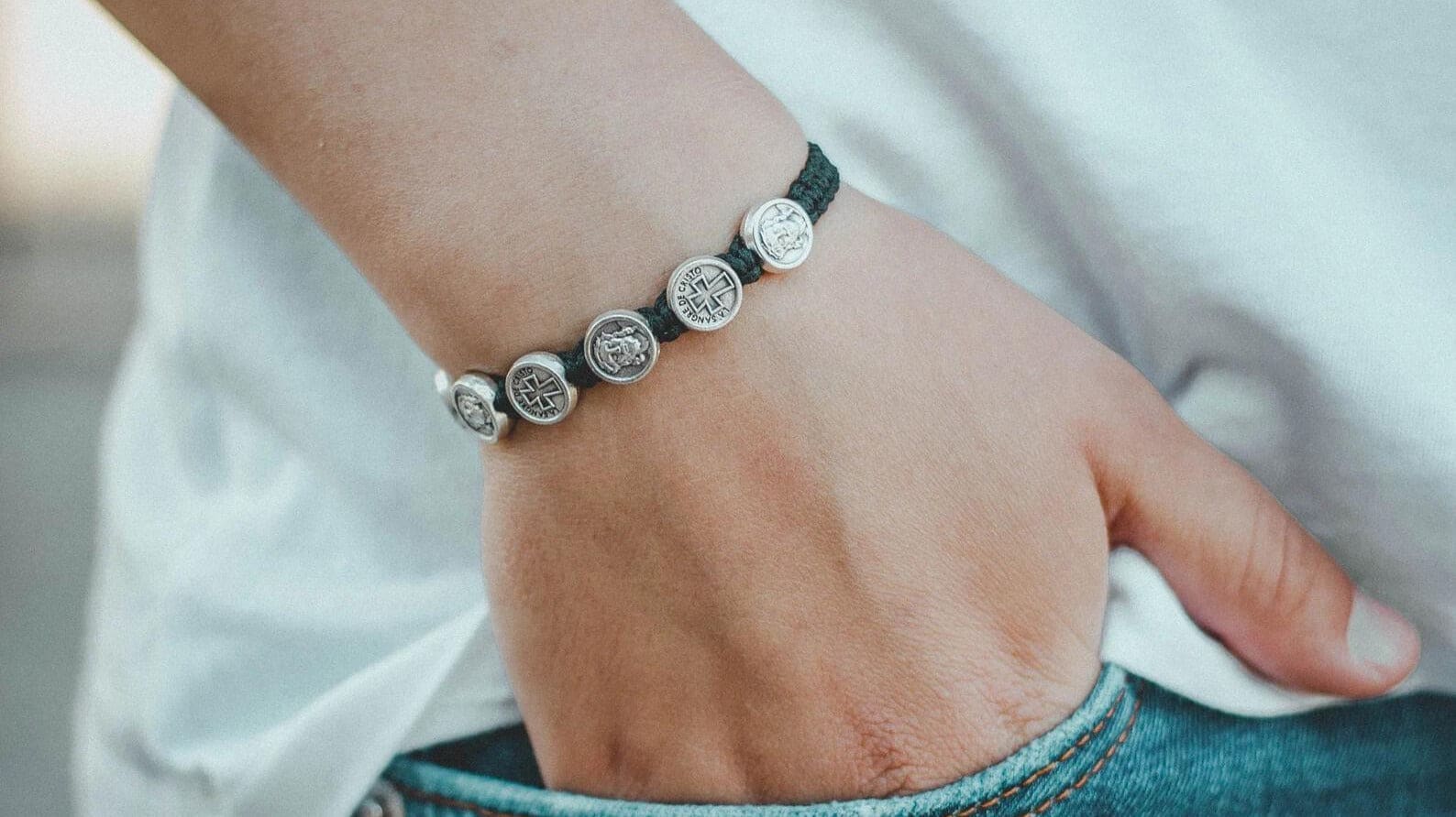 Ce bracelet porte cette dévotion au poignet. En son centre se trouve une médaille argentée de la Sainte Face de Jésus, fabriquée en Italie, qui reproduit l’image sacrée faisant écho au Saint-Suaire de Turin et à des siècles d’art dévotionnel catholique. La finition sobre et lumineuse de l’argenté confère à la médaille un caractère recueilli et discret — tout à fait approprié pour une dévotion de nature contemplative. Chaque bracelet est assemblé à la main en Bosnie, associant des médailles de fabrication italienne à un cordon, avec un soin et une attention que la production industrielle ne peut tout simplement pas égaler.